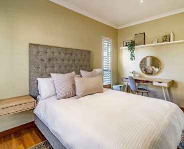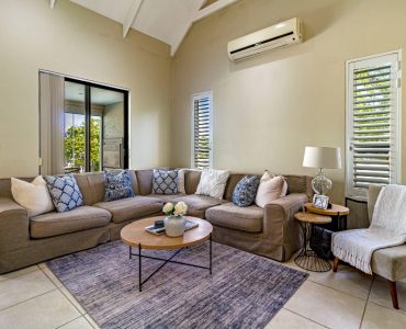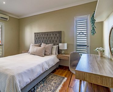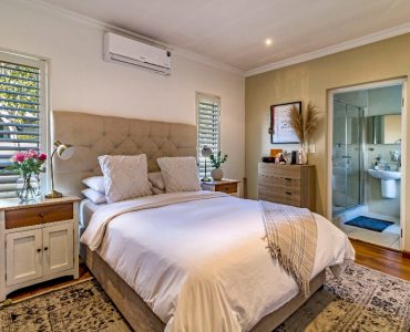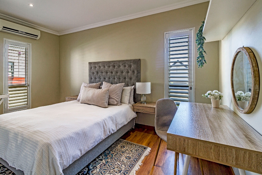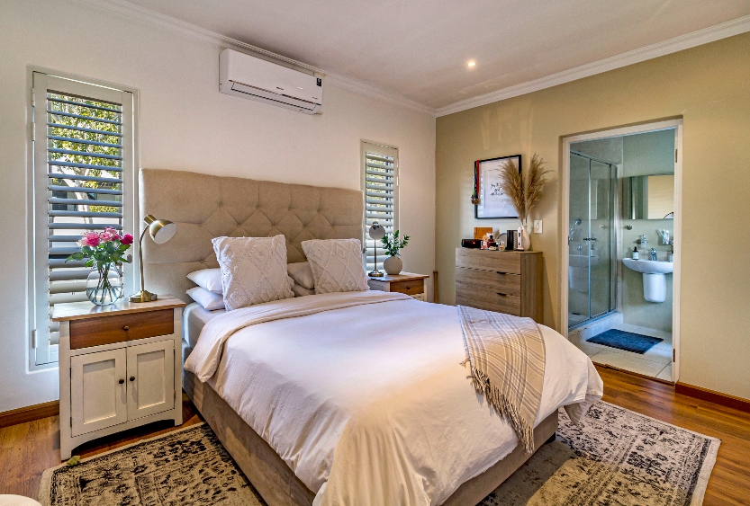 The main bedroom offers air-conditioning and a stylish en-suite bathroom. A garden gate opens directly onto a quiet pathway leading to a nearby park area within the estate.