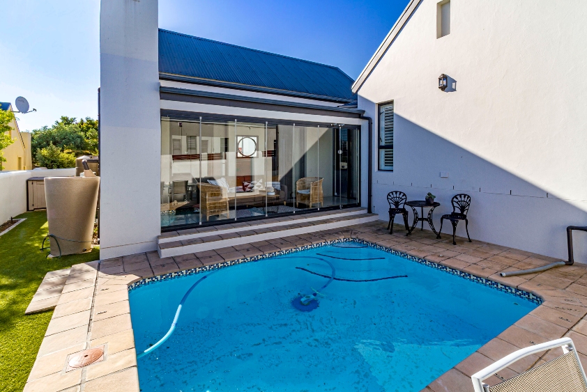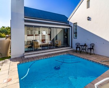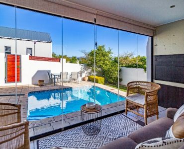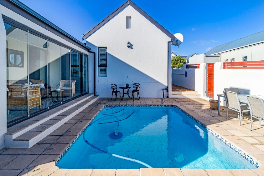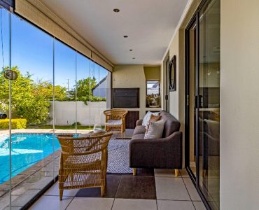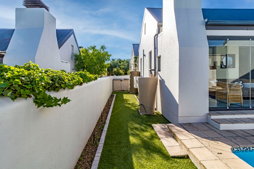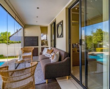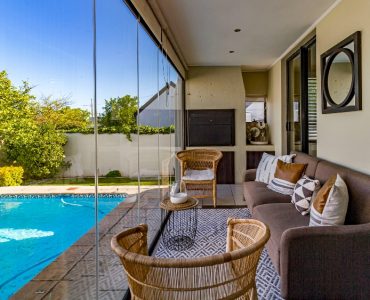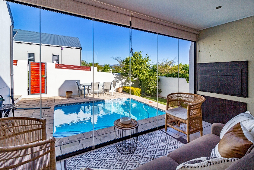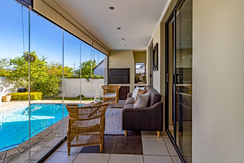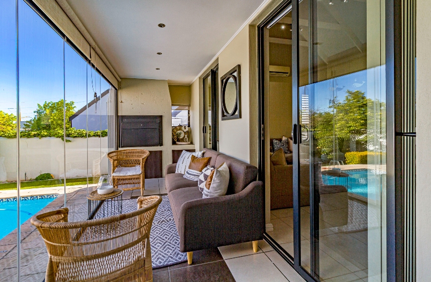 The enclosed patio with frameless glass stack doors and a built-in braai overlooks the sparkling pool and manicured garden, creating an ideal space for relaxed indoor-outdoor living. Two water tanks are neatly positioned on the side of the home, adding to its practicality.