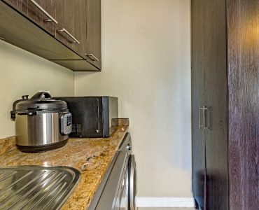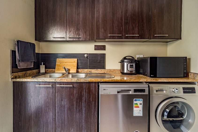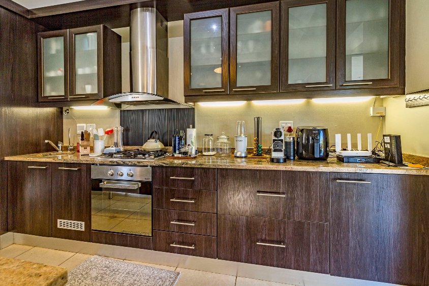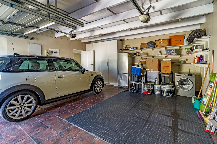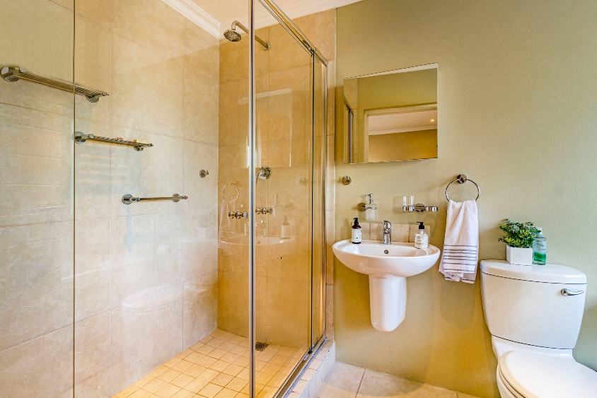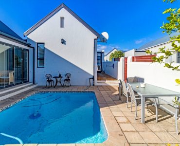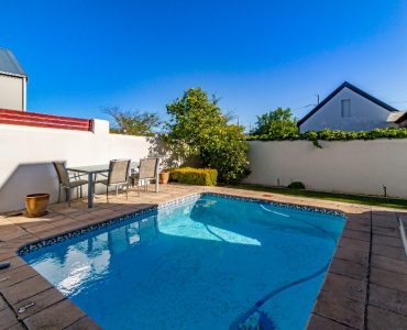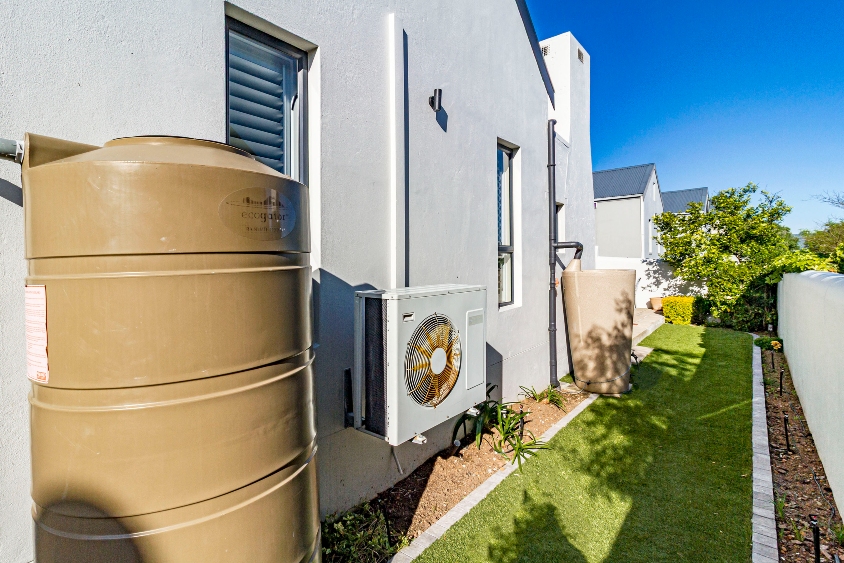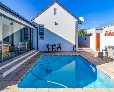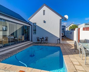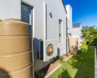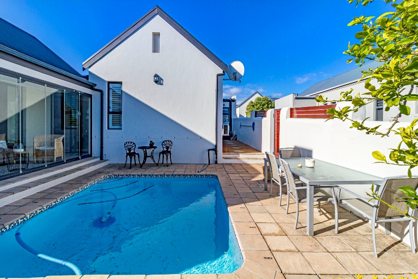 The enclosed patio with frameless glass stack doors and a built-in braai overlooks the sparkling pool and manicured garden, creating an ideal space for relaxed indoor-outdoor living. Two water tanks are neatly positioned on the side of the home, adding to its practicality.